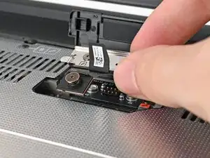 Используйте пальцы, чтобы сдвинуть модуль тачпада к нижнему краю ноутбука и отсоединить его.