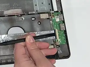 Поместите плоский конец лопатки под защелку разъема ZIF, соединяющего кнопку питания. Нажмите лопаткой вверх и влево, отсоединяя кнопку питания.