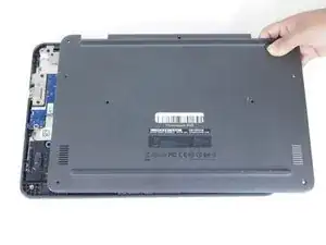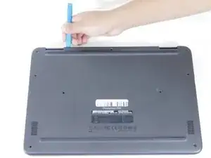С помощью инструмента для вскрытия подденьте правый верхний угол у петель ноутбука.