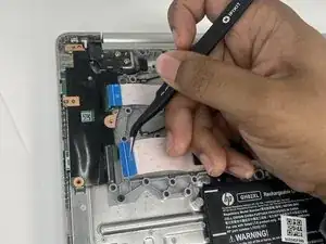 Используйте пинцет, чтобы захватить синюю тяговую язычок нижнего ленточного кабеля, затем вытащите ленточный кабель прямо из разъёма.