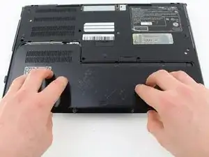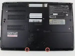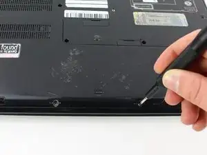Удалите два винта Phillips #0 длиной 3 мм на нижней стороне компьютера, которые удерживают пластиковую заднюю крышку.