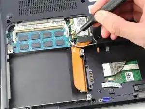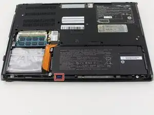 Удалите единственный винт Phillips #0 длиной 3 мм, расположенный на плате WiFi в верхнем левом углу от отсека аккумулятора.