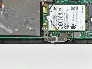 Удалите один винт с крестообразным шлицем длиной 3 мм, закрепляющий металлический кронштейн WWAN и плату WWAN на материнской плате.