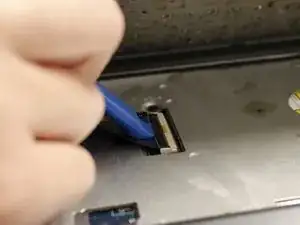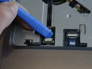 Воспользуйтесь инструментом для вскрытия, чтобы отсоединить ленточный кабель клавиатуры от разъёма, подняв верхнюю защёлку.