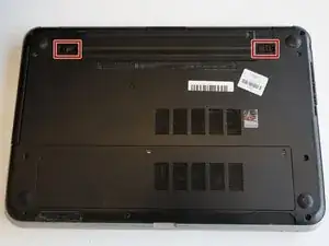 Закройте крышку экрана и переверните ноутбук, чтобы увидеть фиксаторы аккумулятора.