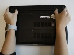 Переверните ноутбук так, чтобы клавиатура оказалась сверху.