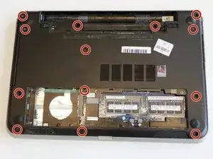 Выкрутите тринадцать винтов длиной 5 мм с крестообразным шлицем №000 с задней крышки ноутбука.