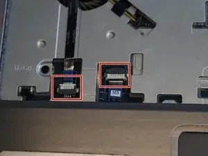 Подставка для рук, подключённая двумя ленточными кабелями, представляет собой внутреннюю крышку компьютера, в которой установлена сенсорная панель. Трещина на подставке может привести к повреждению внутренних компонентов ноутбука, а неисправные ленточные кабели — к сбоям в работе тачпада.