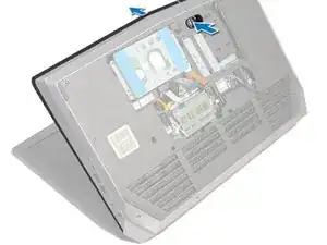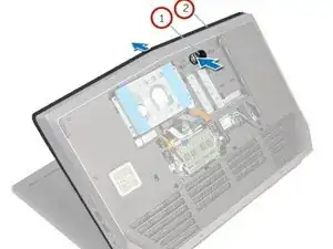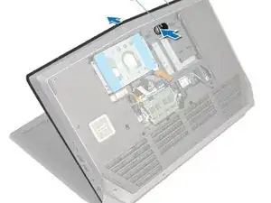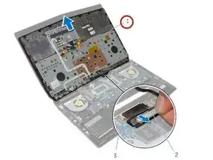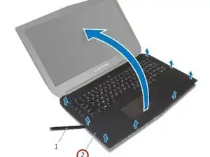 Приподнимите основание компьютера и протолкните узел подставки под ладони через щель в основании, чтобы освободить защелки на узле подставки под ладони.
