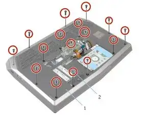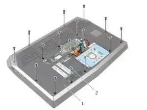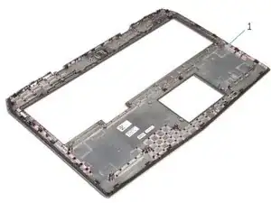Удалите винты, фиксирующие узел подставки под ладони к основании компьютера.