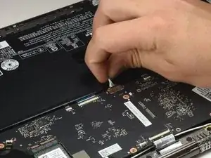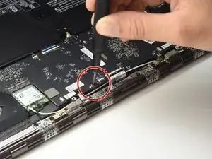 Выньте ленточные кабели из открытых разъёмов с помощью пинцета iFixit Tweezers, чтобы освободить материнскую плату.