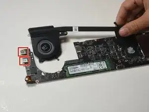 Отключите красный и чёрный провод от материнской платы с помощью пинцета iFixit Tweezers.
