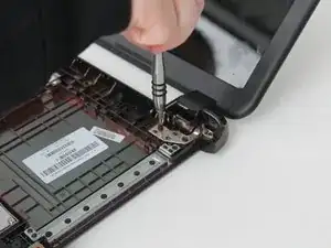 Открутите два винта в верхнем левом углу и три винта в верхнем правом углу на металлических петлях монитора.