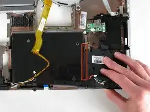 Вытащите чёрный кабель, идущий вдоль левой стороны правой акустической единицы, чтобы снять её.