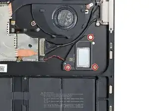 Используйте отвёртку Torx T3, чтобы выкрутить три винта 2.6 мм, крепящие правый динамик.