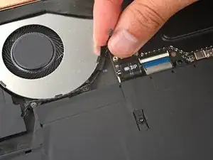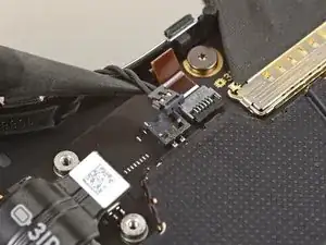 Вставьте плоский конец пластиковой лопатки под верхний край нажимного разъёма батареи и подденьте, чтобы отключить его.