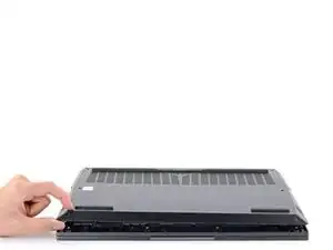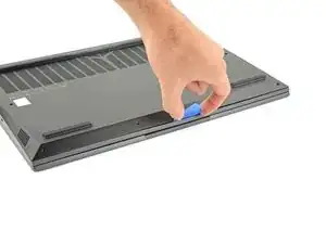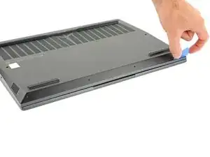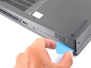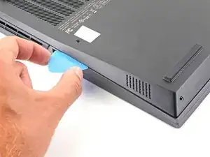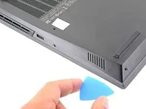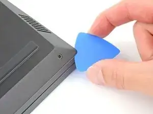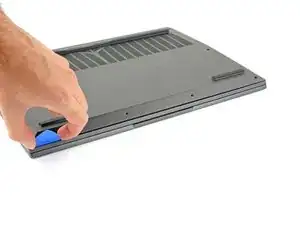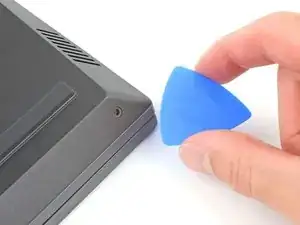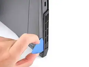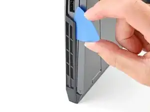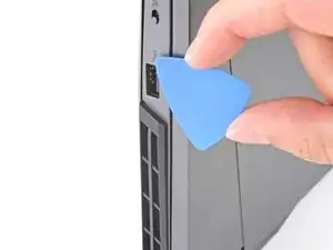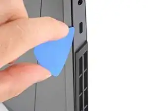 Сдвиньте закруглённый край лезвия для вскрытия между рамой и пластиковыми вентиляционными решётками по левому краю рядом с портом USB-C.