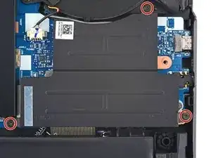 Используйте крестовую отвертку, чтобы выкрутить три винта PH00, 5.1 мм, крепящие экран правого SSD к материнской плате.