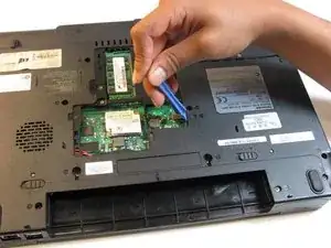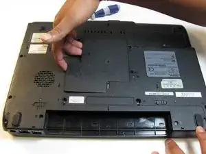 Переверните ноутбук вверх дном и вытяните правый рычаг разблокировки наружу.