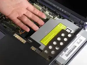 Аккуратно вставьте привод DVD в ноутбук. Если привод застревает при вставке, слегка нажмите вниз на металлический отсек под приводом, чтобы обеспечить его продвижение.