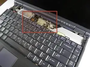 Используя отвёртку с крестообразным шлицем, снимите винт панели питания, расположенный с левой стороны ноутбука. На фото место расположения винта выделено красной рамкой.