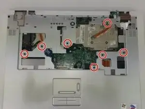 Удалите семь винтов с крестообразным шлицем длиной 6 мм, удерживающих тачпад/подлокотник на материнской плате.