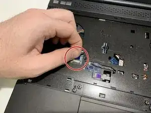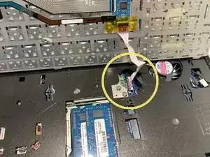 Отключите кабель данных клавиатуры от системной платы, перевернув фиксатор ZIF и аккуратно вынув кабель.