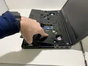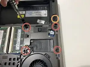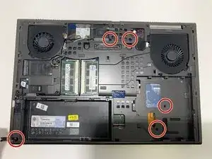 Удалите пять винтов 3 мм Phillips #00, которыми нижняя панель подставки для клавиатуры крепится к нижней части ноутбука.