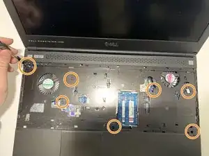 Удалите двенадцать винтов 5 мм Phillips #00, которыми верхняя панель подставки для клавиатуры крепится к стороне клавиатуры ноутбука.
