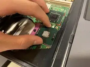 Когда прокладка чипсета приблизительно достигнет разъёма клавиатуры, вытяните её в направлении к батарейке типа «монетка».