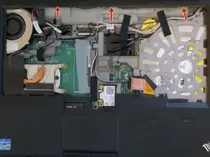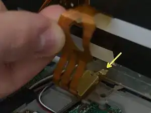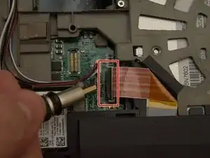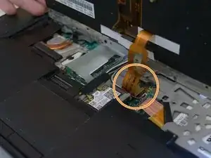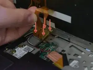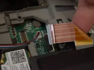 Найдите шлейф возле тачпада, выделенный красным цветом, используйте плоскую отвертку или другой плоский предмет, чтобы поднять рычаг блокировки и освободить разъём шлейфа.