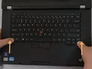 Возьмите ободок клавиатуры за два нижних угла (рядом с тачпадом) и поднимите ободок вверх и прочь от дисплея (от себя).