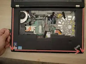 Начните поддевать ободок клавиатуры с краёв с помощью медиатора или пластикового инструмента между ободком клавиатуры и корпусом ноутбука, как показано красным цветом.