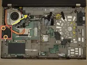 Используя отвертку Philips M2, удалите 2 винта, выделенные желтым цветом. Нижний винт находится под жестким диском, который уже должен быть снят.