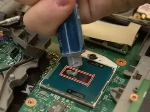 Используя шприц с термопастой, нанесите количество термопасты размером с горошину на кристалл, выделенный красным цветом.