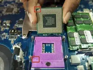 При повторной установке процессора убедитесь, что процессор правильно выровнен. Обратите внимание на отсутствующие контакты на углу и сопоставьте их с разъёмом.