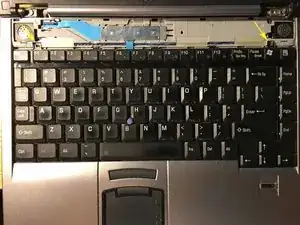 Под накладкой скрыты два винта, удерживающие клавиатуру. Удалите эти винты. См. второе фото.
