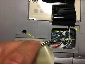 Переверните ноутбук вверх дном. Освободите пластиковые фиксаторы, удерживающие верхнюю часть корпуса к нижней. Будьте осторожны, так как некоторые кабели ограничивают движение.