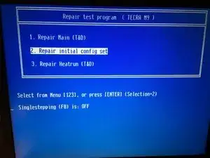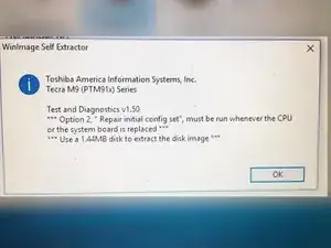 Загрузите свой Tecra M5 с дискеты обслуживания. Выберите опцию 2: «Repair initial config set». Должно произойти автоматическое выключение, но на моём ноутбуке система не завершилась. В итоге я извлёк дискету и перезагрузил ноутбук Tecra M5.