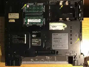Выключите ноутбук. Переверните его и удалите только отмеченные винты.