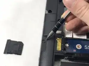 Удалите винты Phillips 4 мм под слотом для SD-карты слева на ноутбуке.