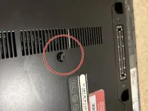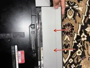 Переверните ноутбук и нажмите два зажима, показанные на фото, внутрь до щелчка. Сдвиньте батарею вверх, отводя её от корпуса, чтобы извлечь.
