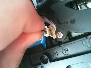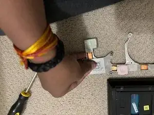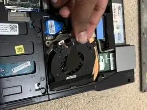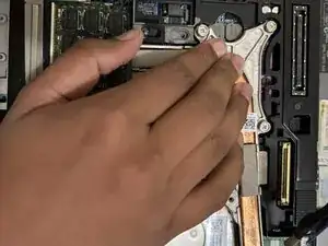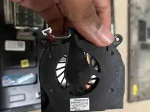 Снимите кусочек черной ленты, заполняющей соединение вентилятора с вытяжным отверстием. Поднимите левую сторону вентилятора рядом с батареей CMOS, чтобы извлечь вентилятор.