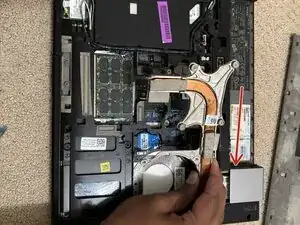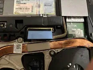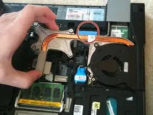 Отключите синий разъем рядом с верхним правым винтом радиатора (кабель дисплея, окружен красным) аккуратно потянув за синюю защелку. Аккуратно отведите кабель и/или зафиксируйте его лентой на шасси подальше от радиатора.