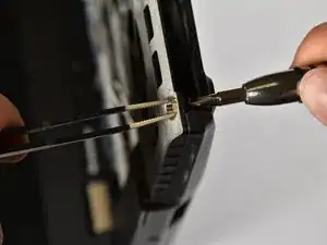 Удалите защитный винт в нижнем углу ноутбука, удерживая золотую крышку пинцетом и отвинчивая крестовой отверткой винт другой рукой.