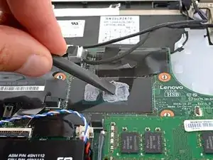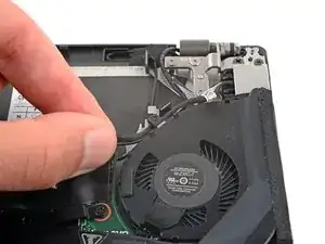 Используйте кончик лопатки или чистый ноготь, чтобы приподнять маленькую шарнирную защёлку на кабеле вентилятора в ZIF-коннекторе ZIF connector.