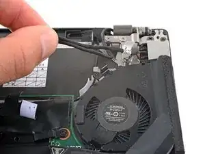 Выведите кабели дисплея из их фиксаторов на верхнем крае вентилятора.
