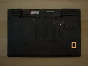 С помощью отвёртки Philips M2 отвинтите 2 винта, выделенные жёлтым. Нижний винт находится под жёстким диском, который должен быть уже удалён.