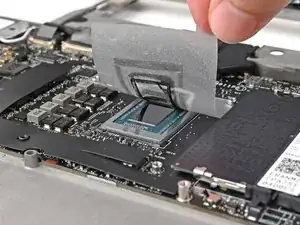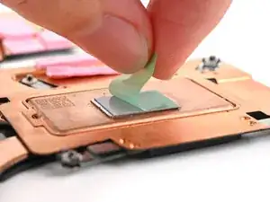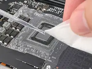 Капните несколько капель изопропилового спирта высокой концентрации (>90%) на безворсовую ткань и протрите остатки термопрокладки.