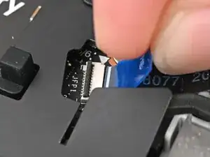 Используйте плоский конец отвертки Framework или чистый ноготь, чтобы прижать фиксатор на ZIF‑разъёме сканера отпечатков.